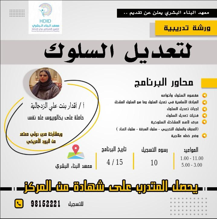 يعلن مركز البناء البشري عن تقديم ورشة تدريبية بعنوان تعديل السلوك